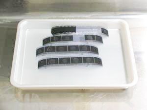 ![]() | 1) | 水洗用のバット状容器(以下「水洗用バット」)にフィルムを並べ、一度に処理できる量を確認します 水が入っていないバットにフィルムを並べてみます。 (手袋をしてフィルムを扱います) 重ならずに余裕を持って並ぶ分が、一度に処理できる量です。 |