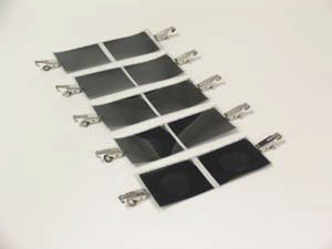 | 35mmフィルムの場合、コマ間が狭いので短辺側の角でパーフォレーション(四角い穴)周辺にクリップを挟みます。画像のように斜にかませると、少しでも多く並べられます。 |
